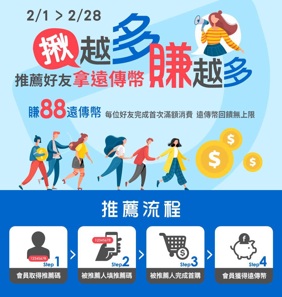 - 好禮_88遠傳幣:被推薦人完成首次消費且滿199元以上且無取消或退貨後,推薦人可獲得88遠傳幣,被推薦人則無人數上限,舉例:有3位被推薦人完成首次滿額消費,則推薦人可獲得264遠傳幣,於2021/3/30匯入指定會員帳號,使用效期為2021/3/30起算30天內有效,不再另行發送通知,遠傳幣使用辦法請參閱本站 遠傳幣使用指南。
