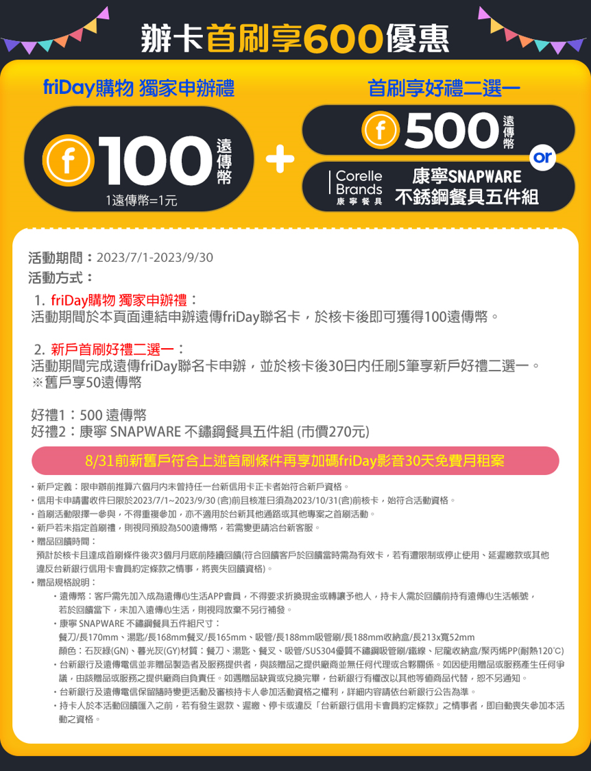 - 活動內容:活動期間於指定辦卡連結申辦遠傳friDay聯名卡,於核卡後30日內任刷一筆,新戶享250遠傳幣回饋,舊戶享100遠傳幣回饋。